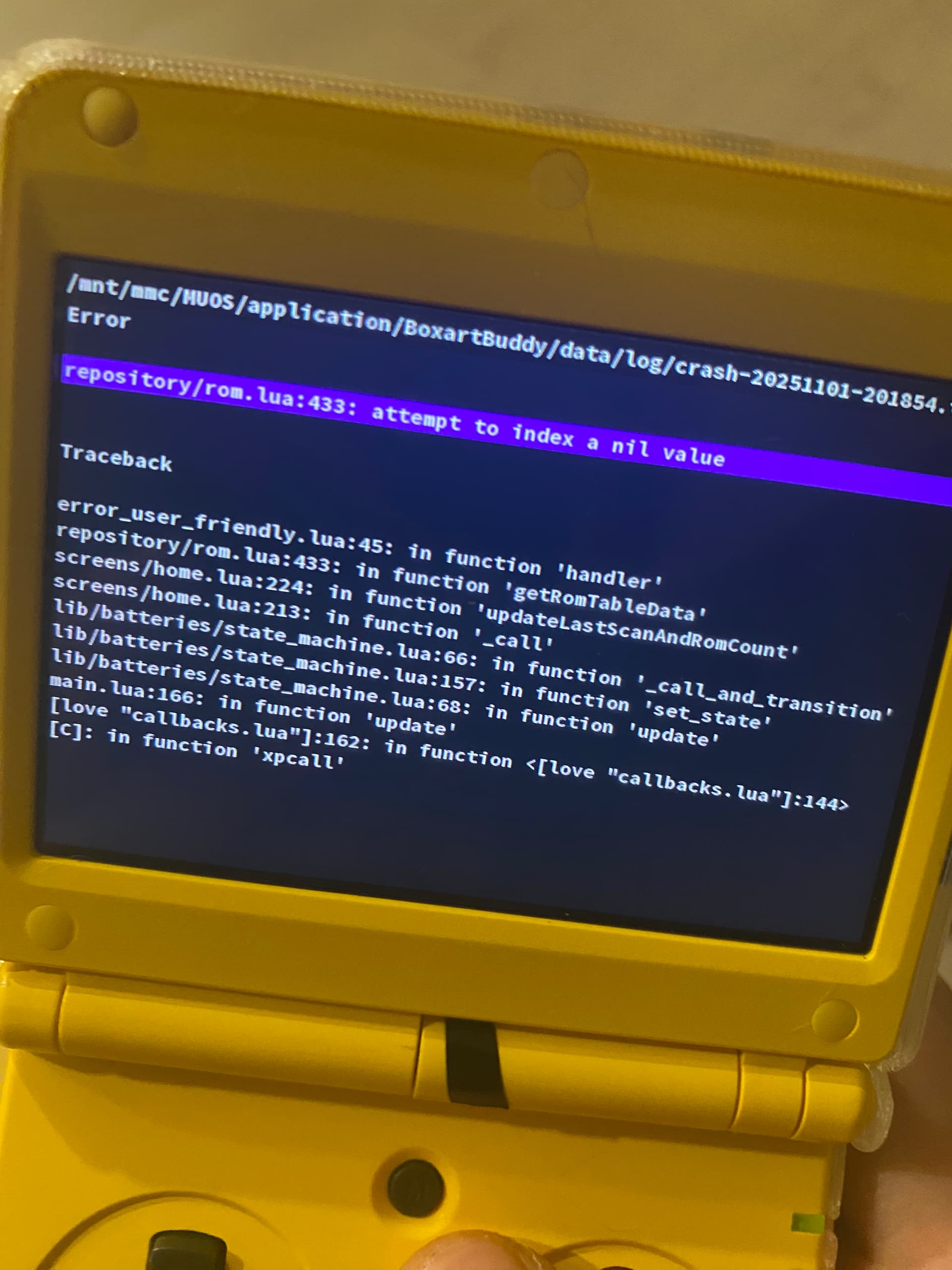 If this isn’t the first time you’ve loaded the application please provide more information so I can try and track down the bug (explain what you did, what scrapes, was it the first time you scraped etc). If you can provide any of the logs from ‘mnt/mmx/MUOS/application/BoxartBuddy/data/log’ then that would help.