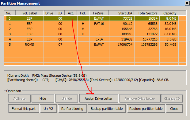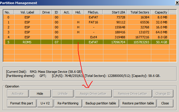 yes, it is what i explained at the beginning, one partiion only (a 8mb space partition) can be assigned to a drive letter and not this “roms” partitions.