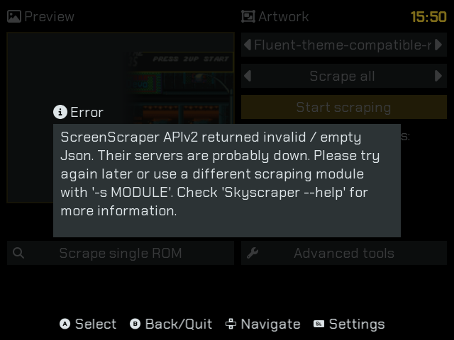 [15:38:36:284] (skyscraper) ERROR: ScreenScraper APIv2 returned invalid / empty Json. Their servers are probably down. Please try again later or use a different scraping module with ‘-s MODULE’. Check ‘Skyscraper --help’ for more information.